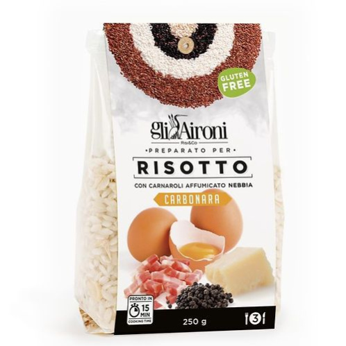 Ingrediënten: Gerookte Carmaroli rijst 91%, groentebouillon (zout, aardappelzetmeel en maltodextrine, gistextract, wortel- en uienextracten, zonnebloemolie, basilicum, peterselie en rozemarijnextracten), eipoeder* 1,5%, Pancetta* 2,2%, Pecorino-kaas* 1,5% (Schapenmelk, Zout, Stremsel), Kurkuma, Nootmuskaat*, Peper, Zout (*gedehydrateerde producten)
